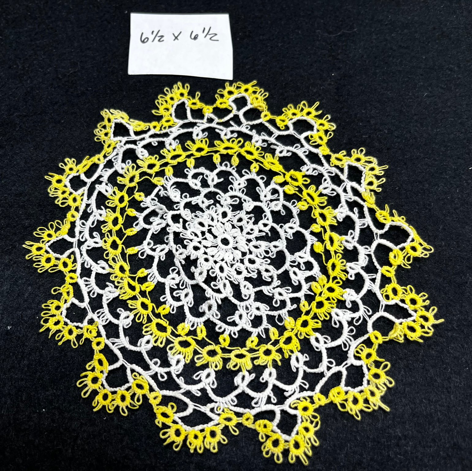 Vintage, handmade tatted doilies. Brown, white & yellow-8x8 and yellow and white 6.6x6.5.