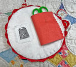 This "taco-shaped" needle book is perfect for holding your needle for your handwork. It is lined with wool-blend felt and includes wool-blend pages, pocket made of vintage a feedsack, small scissors. Closed size: 6" by 3.5".