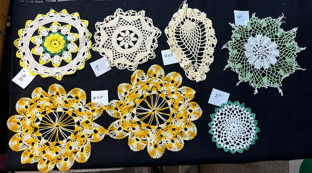 7 handmade cotton doilies. 5" by 5" through 21" by 10". Perfect for your crafting projects!