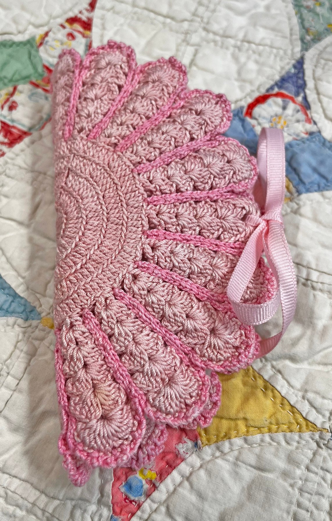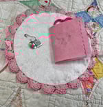 This "taco-shaped" needle book is perfect for holding your needle for your handwork. It is lined with wool-blend felt and includes wool-blend pages, pocket made of vintage a feedsack, small scissors. Closed size: 6.5" by 3.5".