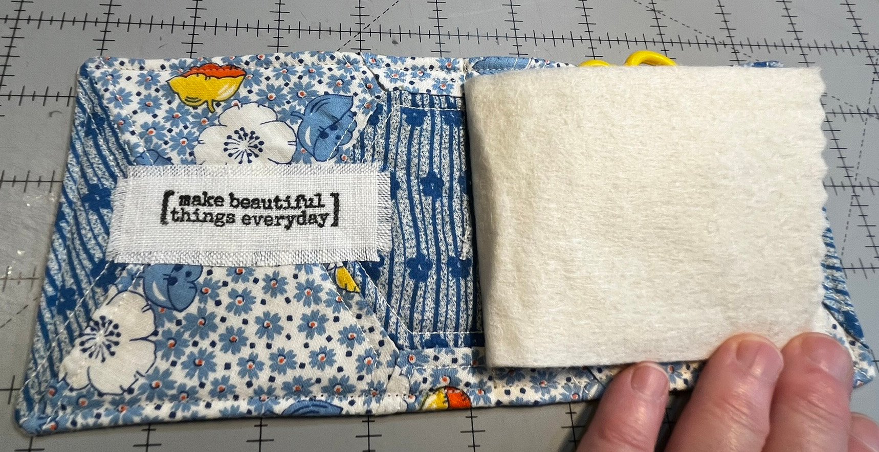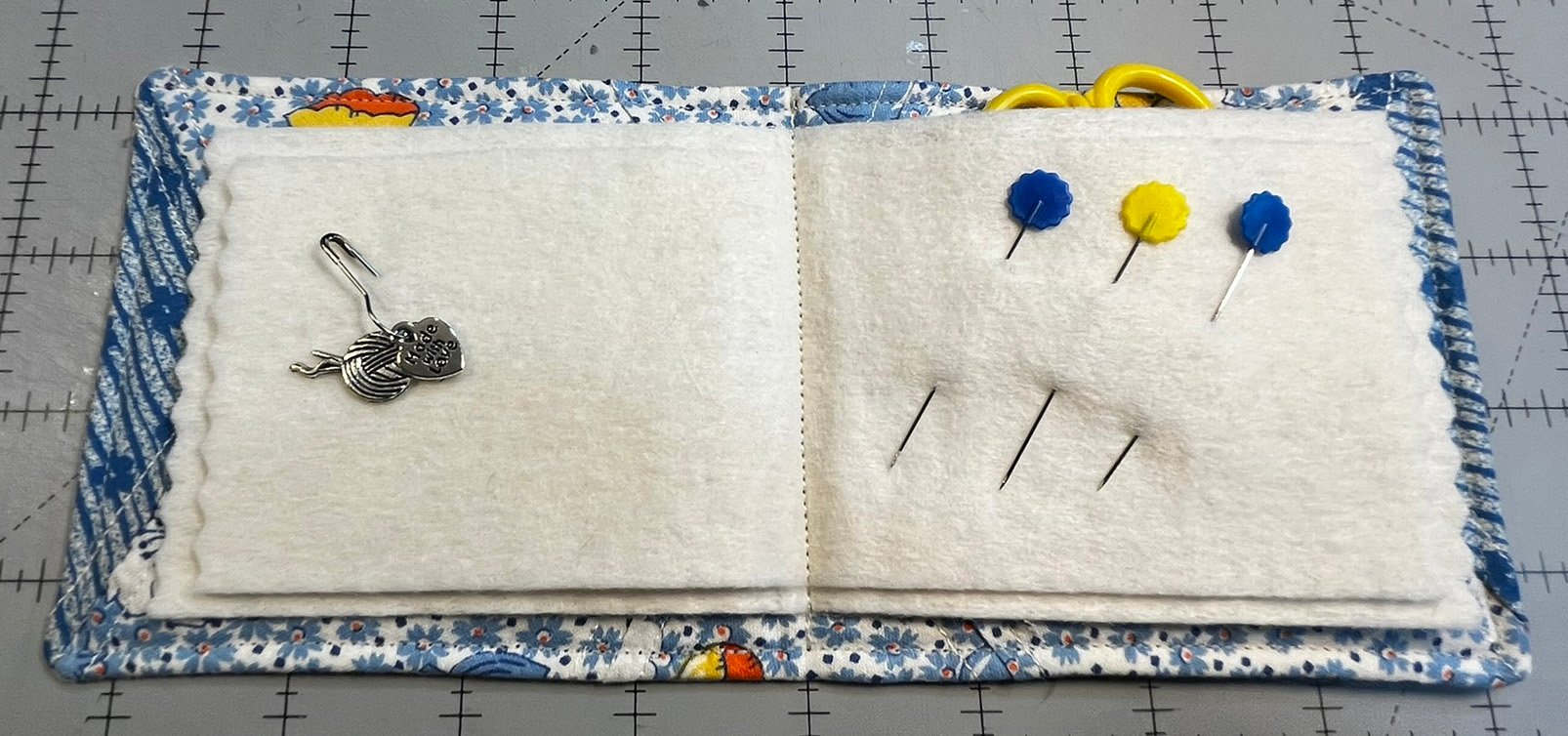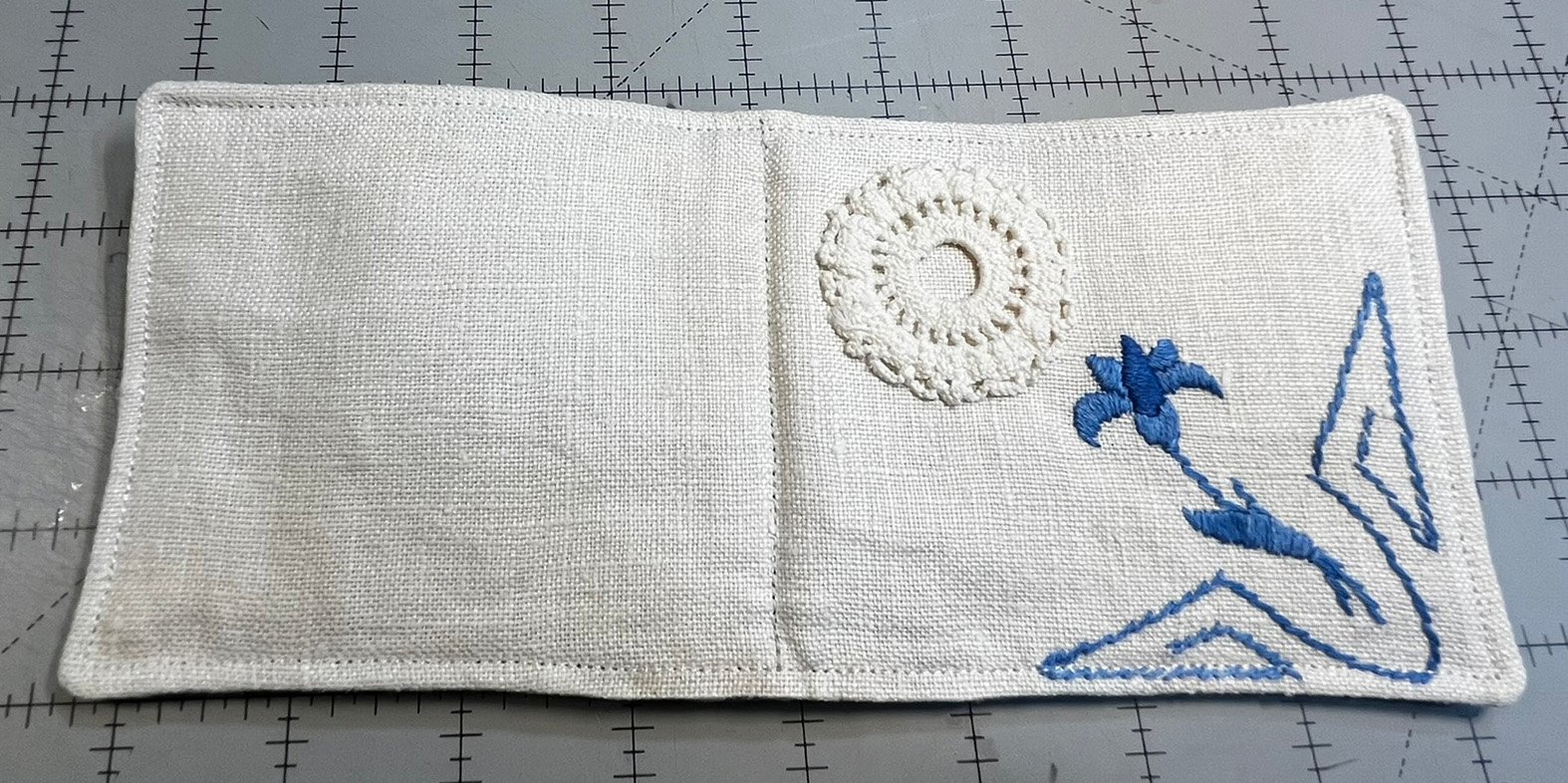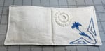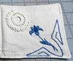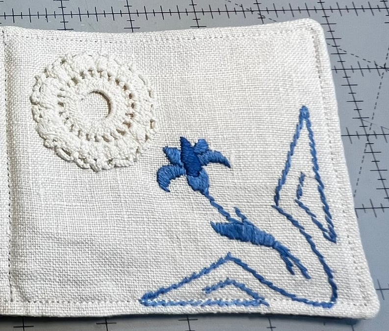 Beautiful vintage linen with blue embroidered flowers. Lined with vintage orphaned quilt block. The pages are made of wool blend felt and the book is adorned with a silver colored charm and vintage fabric pocket. Includes a small scissors, needle threader and packet of thread. 4.25" by 3.5".