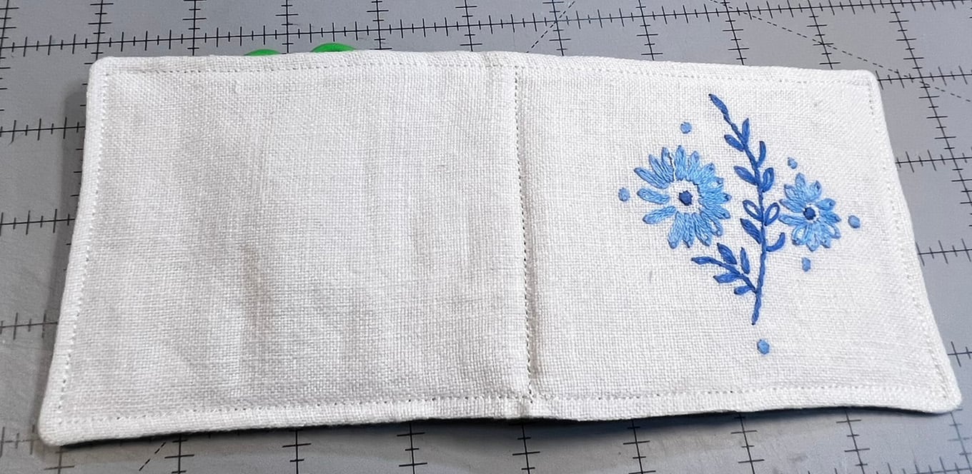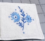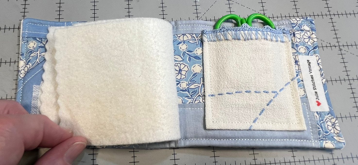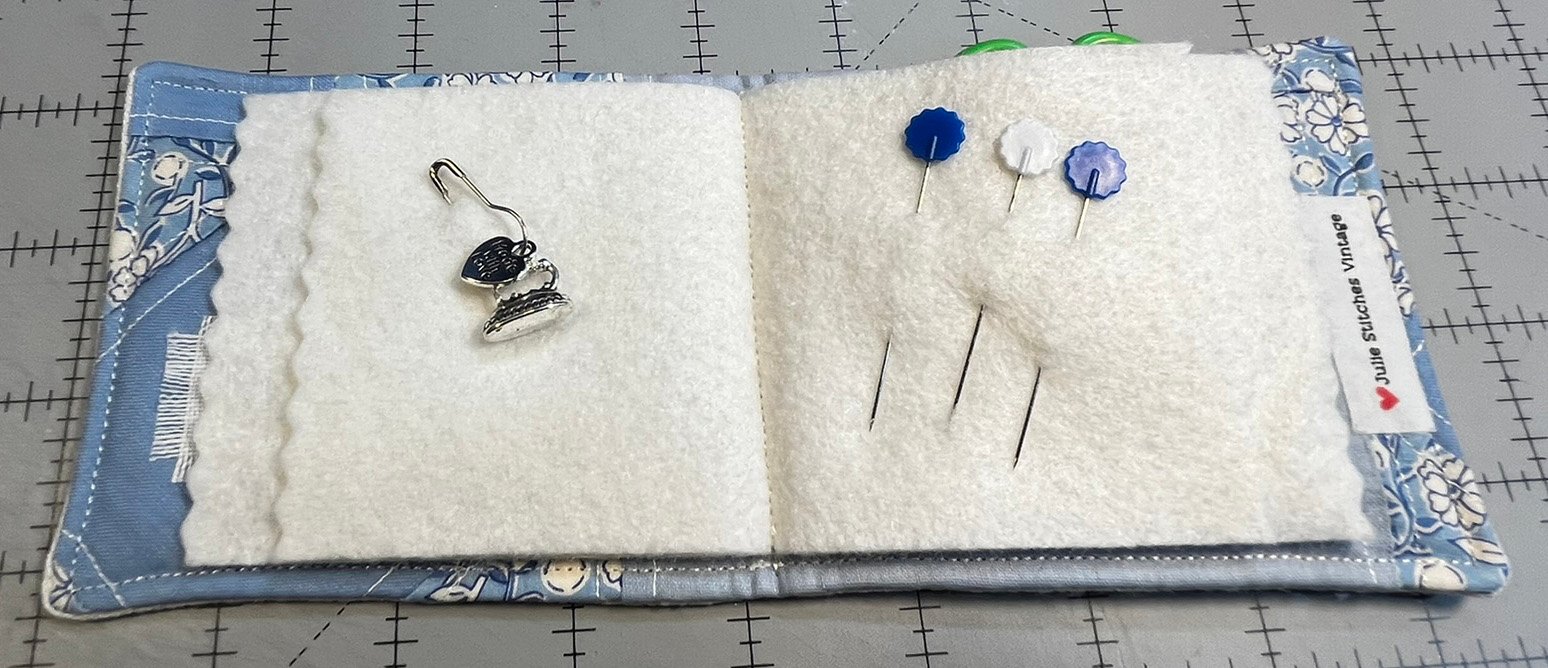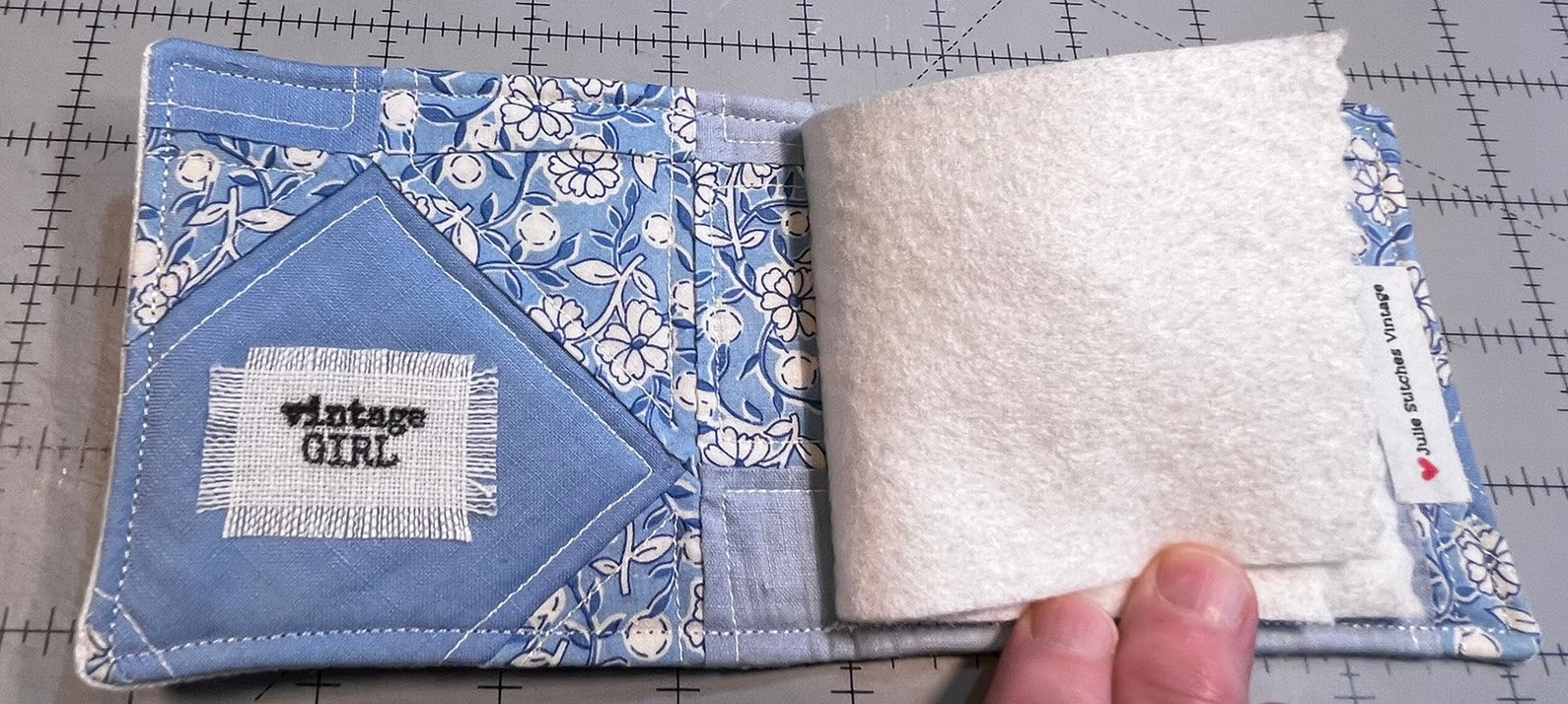 Beautiful vintage linen with blue embroidered flowers. Lined with vintage orphaned quilt block. The pages are made of wool blend felt and the book is adorned with a silver colored charm and vintage fabric pocket. Includes a small scissors, needle threader and packet of thread. 4" by 3.5".