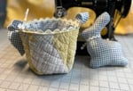 Need a cute little storage solution? Or an Easter gift?This quilted basket is made from a vintage cutter quilt and is lined with new reproduction fabric. It is adorned with a vintage rick rack and a cute tag. 4.25" by 5". Includes a matching bunny 7".