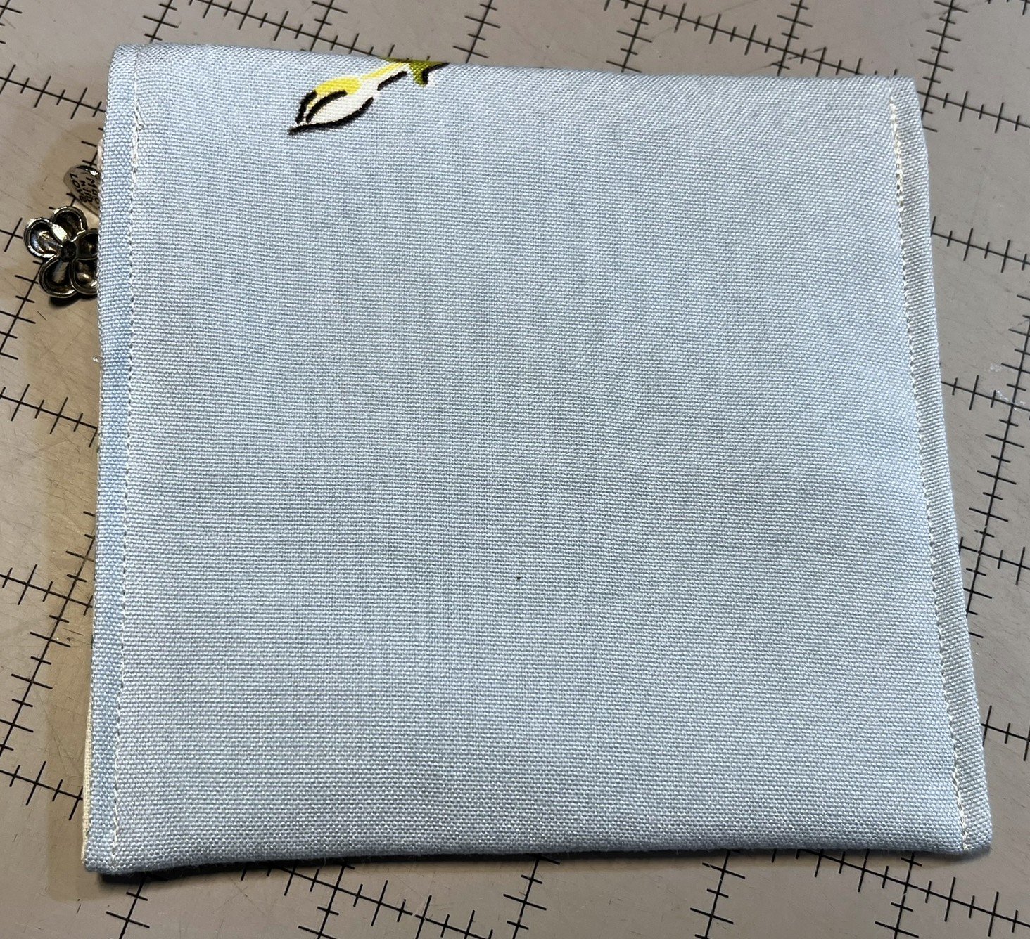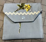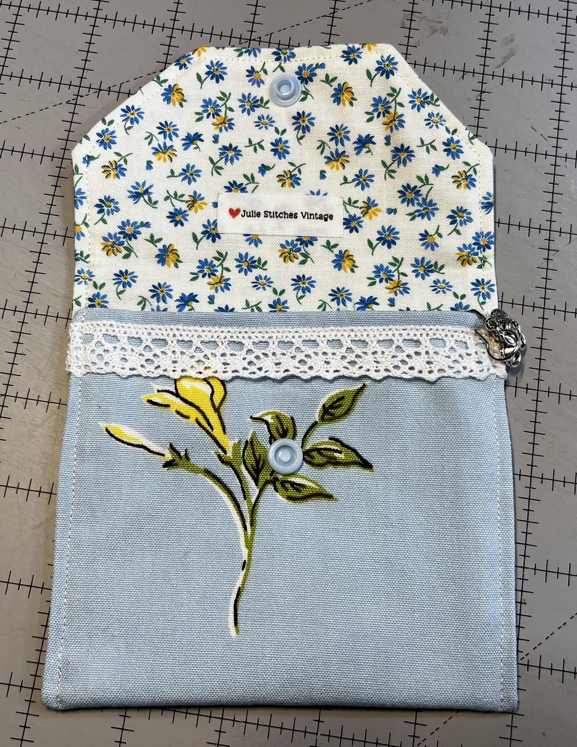 This little wallet is perfect for carrying your ID and cash to the store! It is made with vintage tablecloth, is lined with new fabric and includes vintage rick rack, vintage lace and a heart charm. 5" x 5".