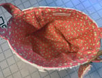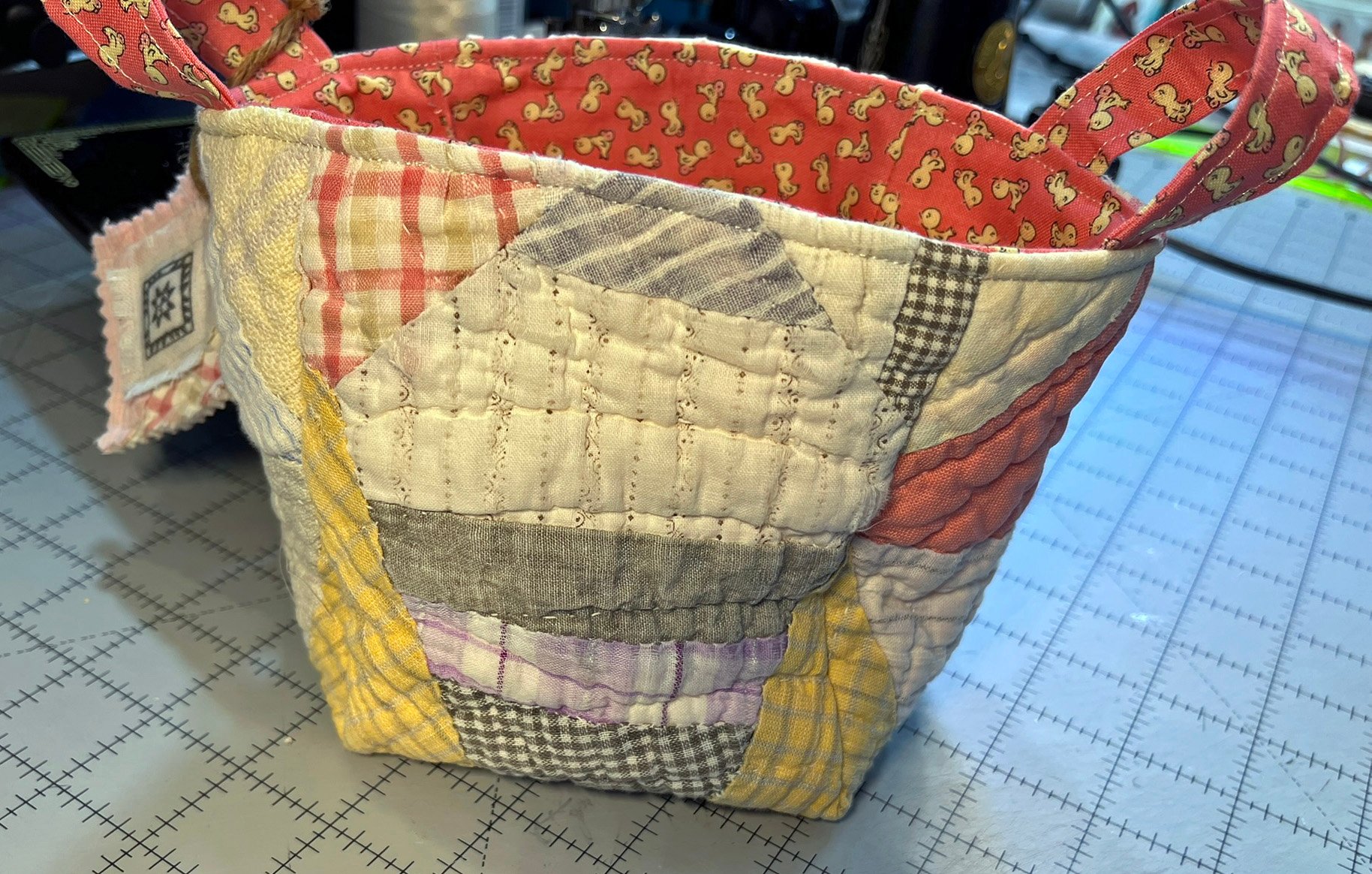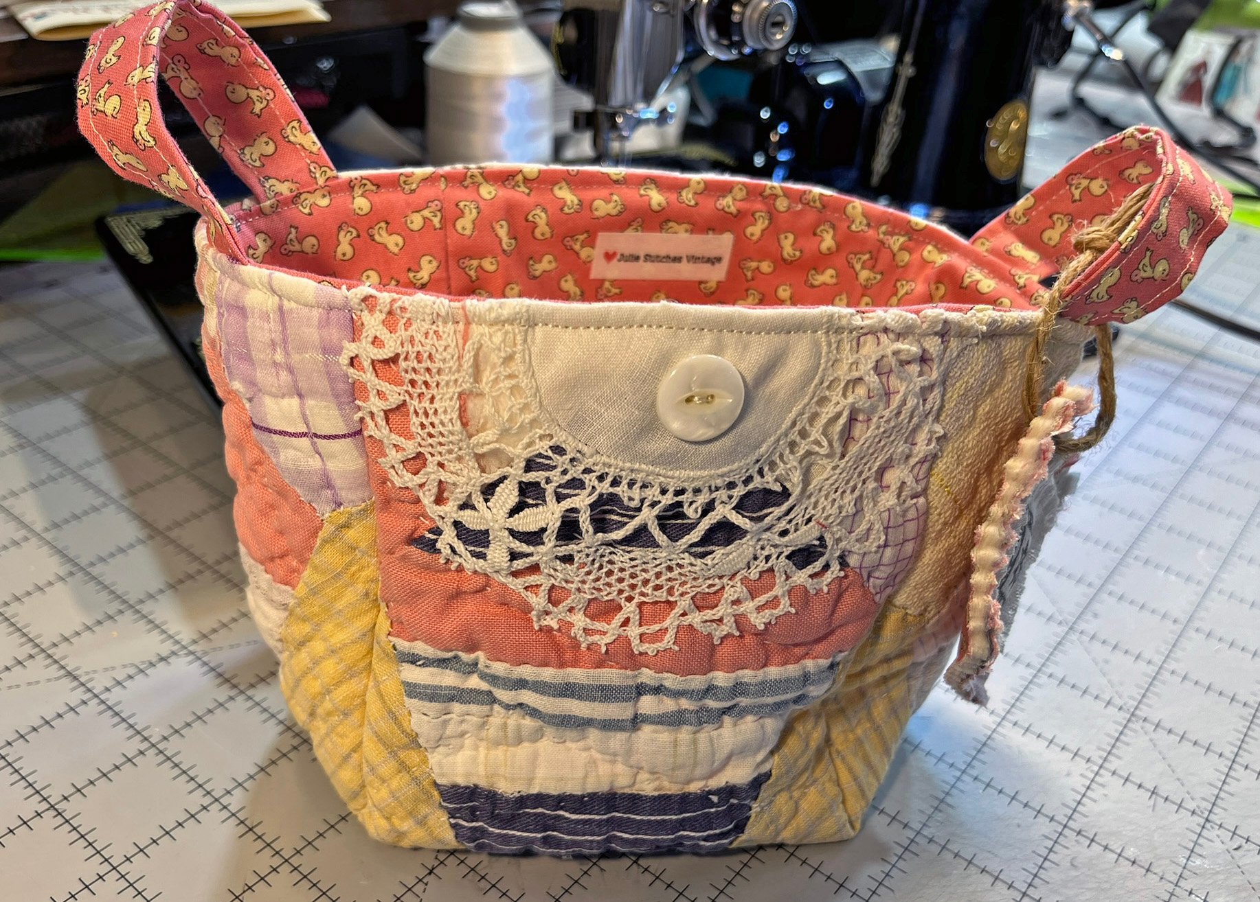 Need a cute little storage solution? This quilted basket is made from a vintage cutter quilt and is lined with new reproduction fabric. It is adorned with a vintage doily and a cute tag. 5" by 5".