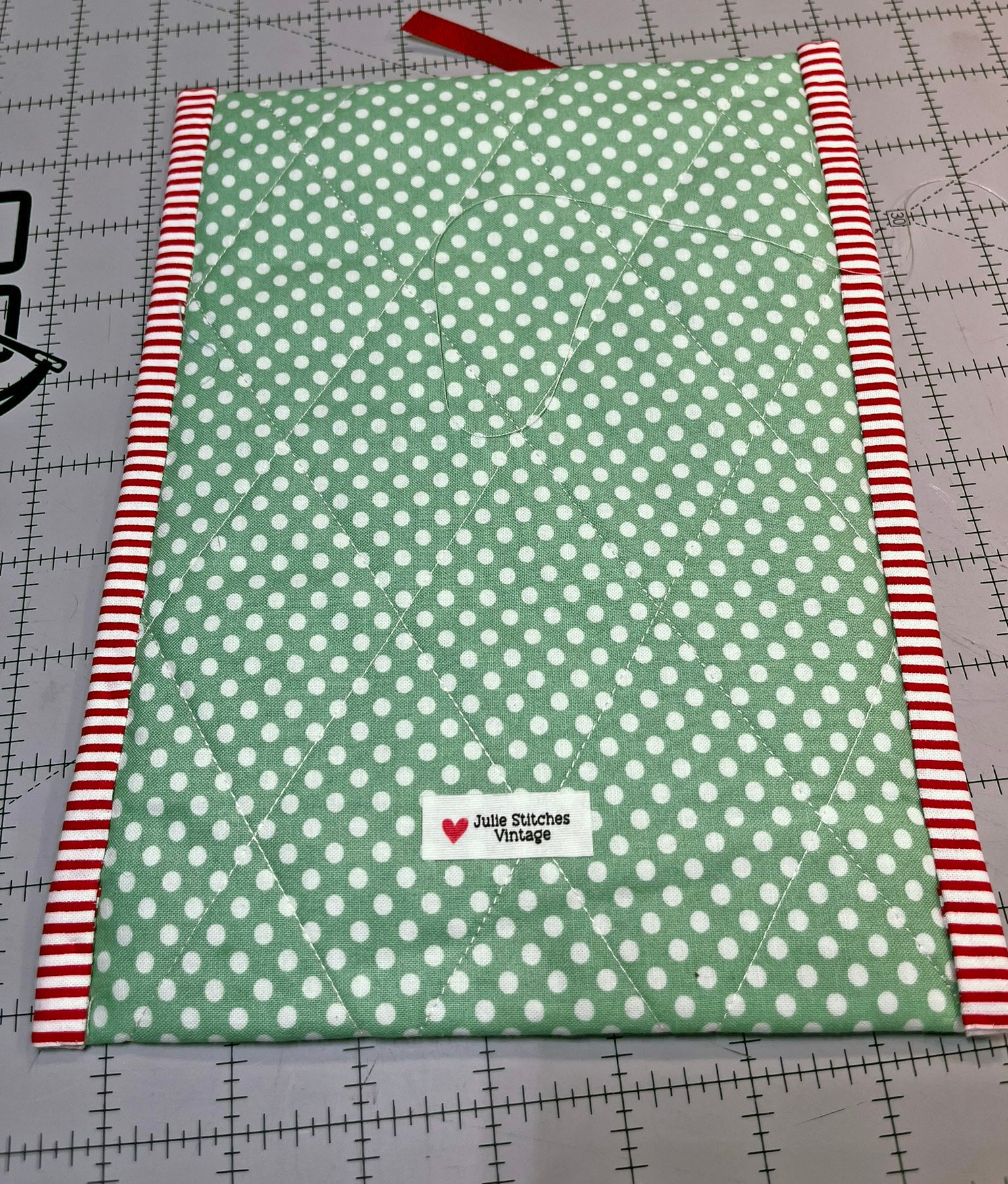 This quilted bag is perfect for your travel or to take to a quilt retreat. It is made with a vintage tablecloth and new fabric for the lining. 7.75" by 10"