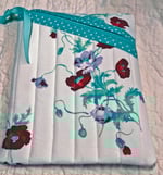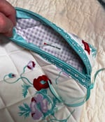 This zippered bag is perfect for travel or to hold notions for your next retreat! It is made with a vintage cotton tablecloth and new fabric. The inside edges are finished with binding. 8.5" by 7". Pattern from Center Street Quilts.