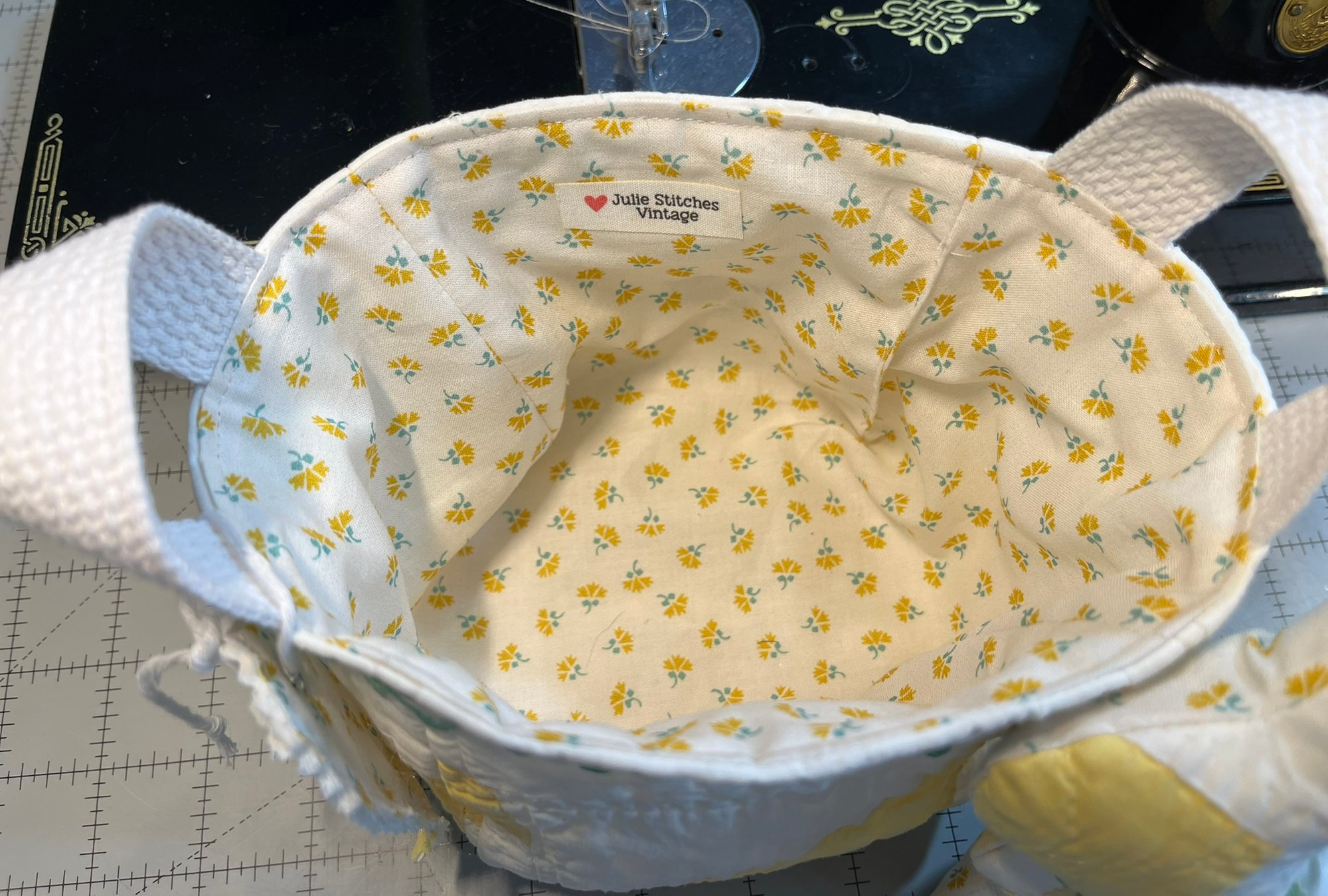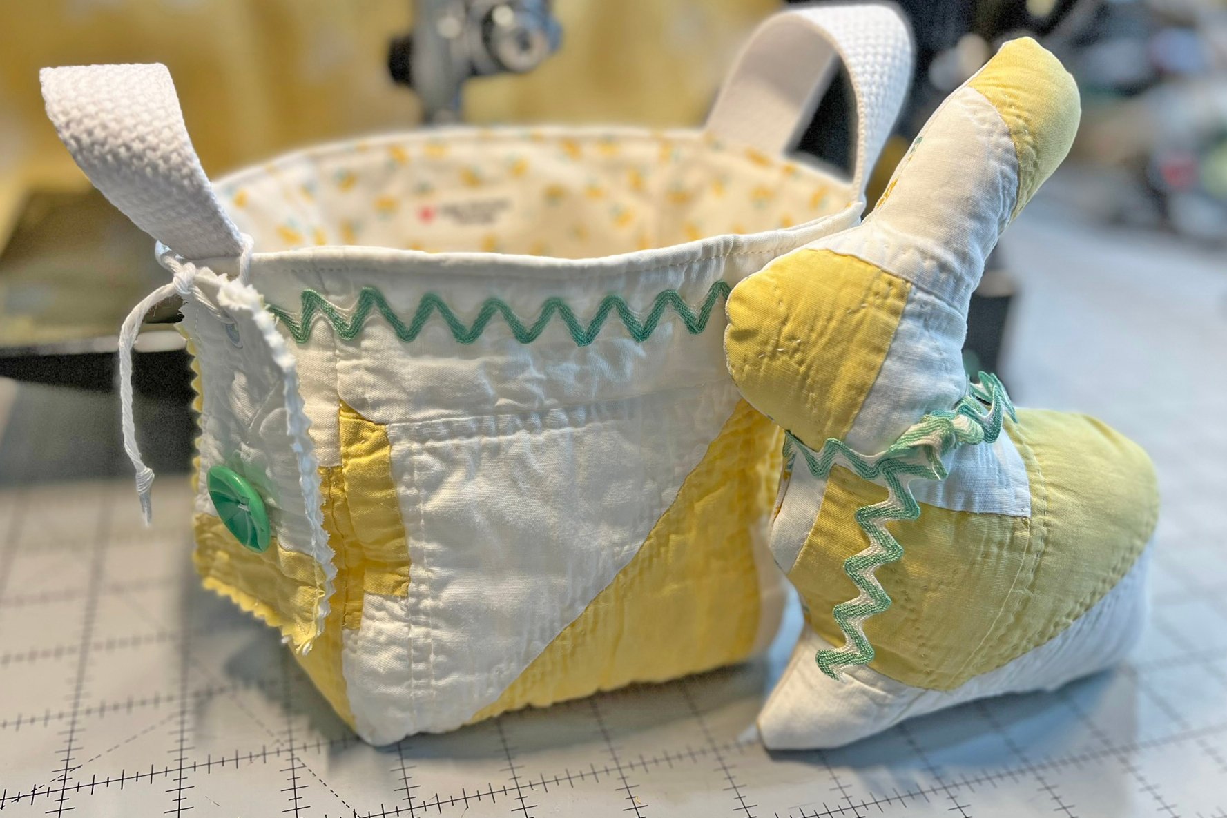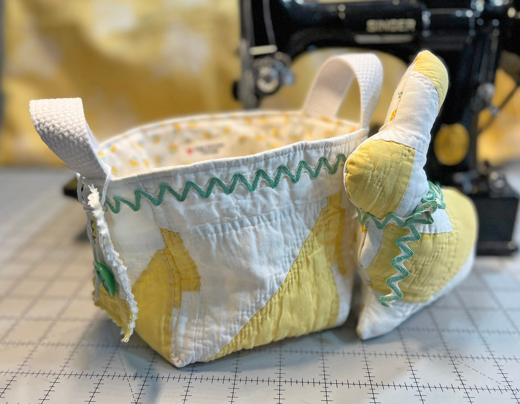 Need a cute little storage solution? Or an Easter gift?This quilted basket is made from a vintage cutter quilt and is lined with new reproduction fabric. It is adorned with a vintage rick rack and a cute tag. 4.5" by 5". Includes a matching bunny 7".