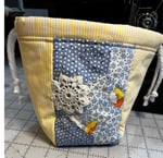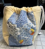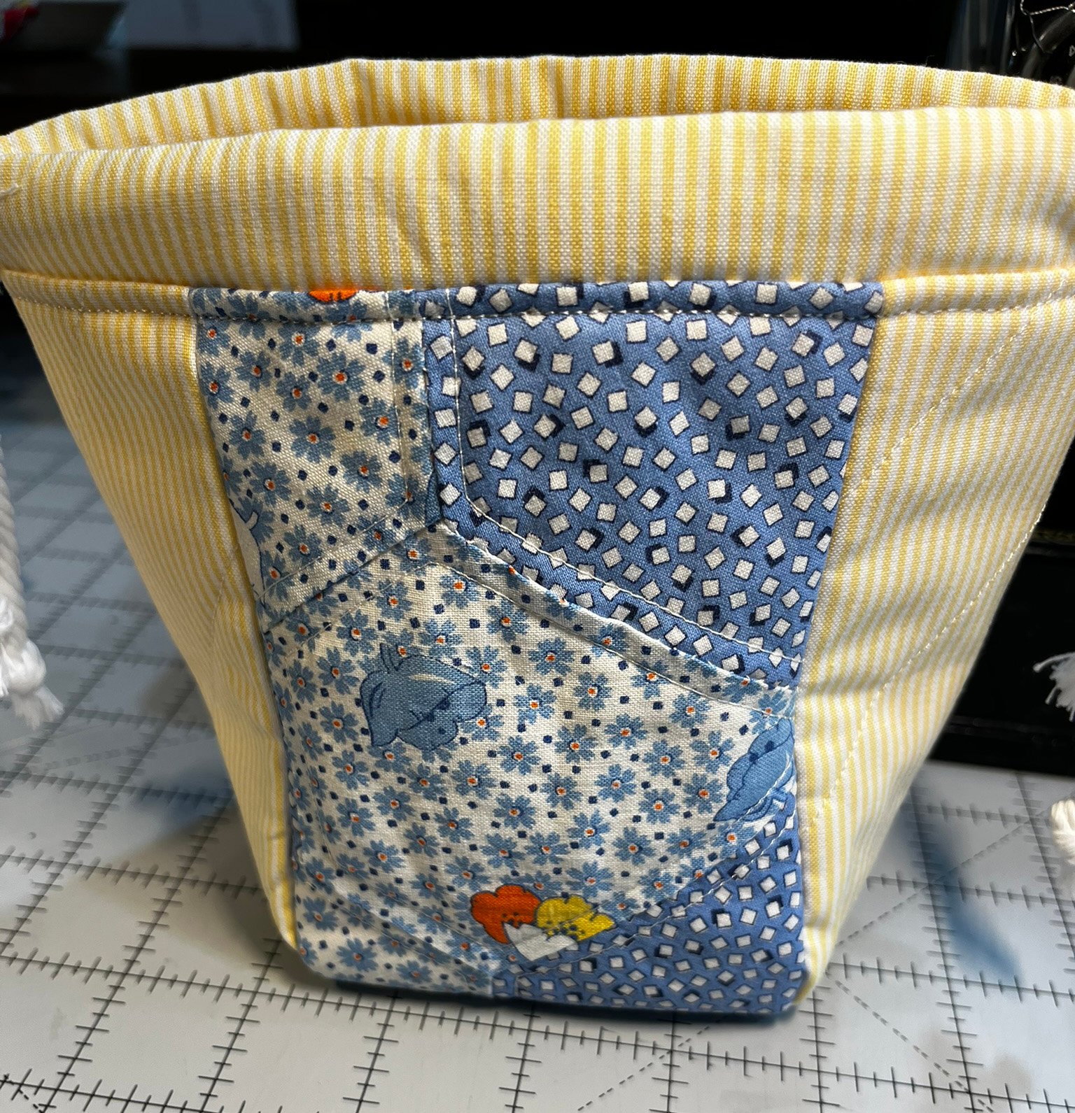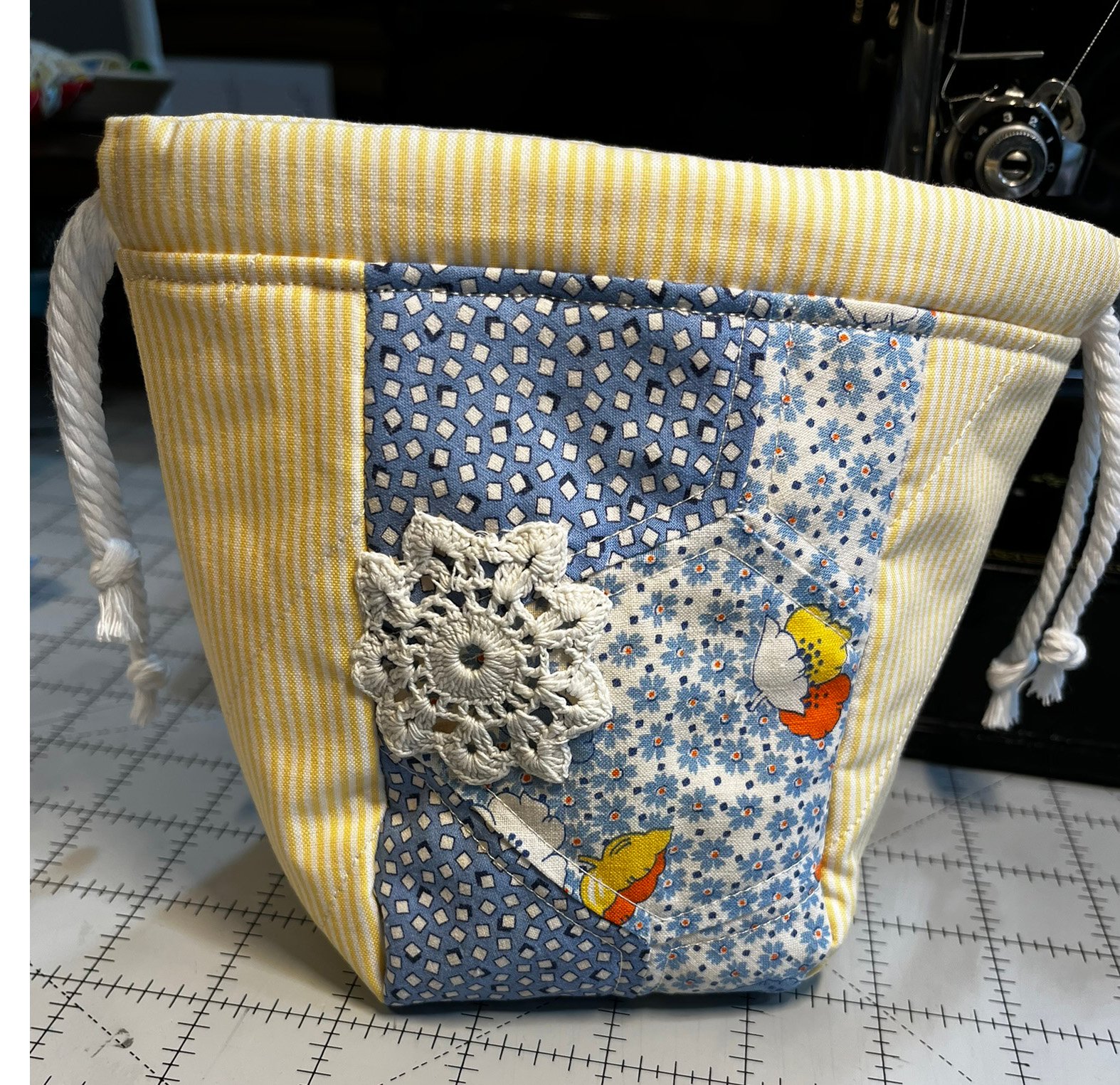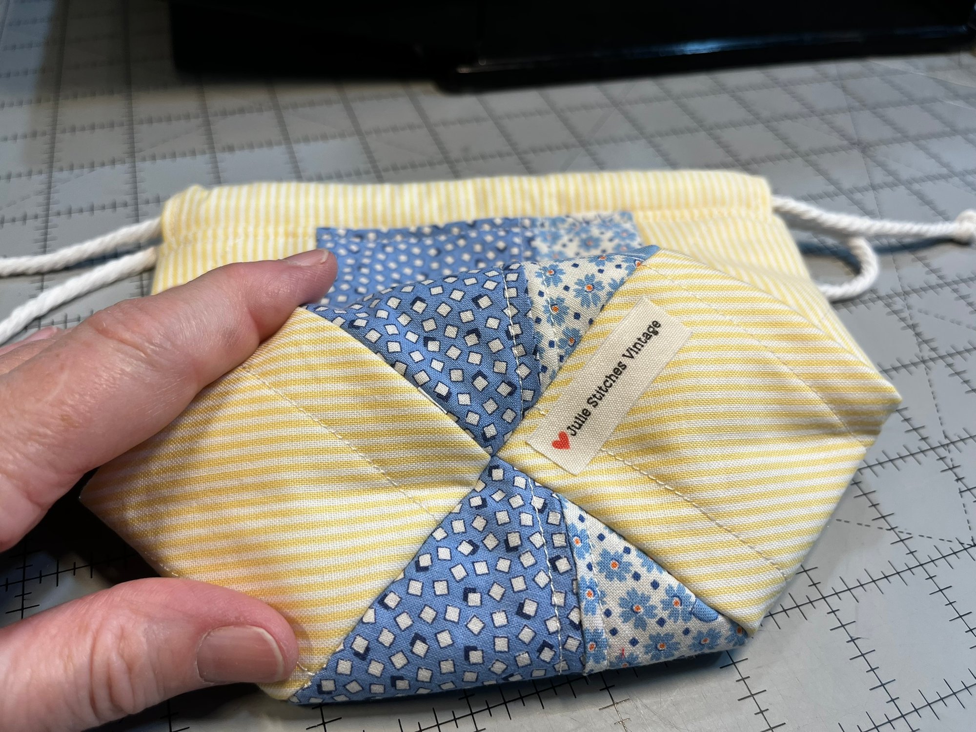 This quilted drawstring bag is darling. Add a bar of scented soap or a candle and you've got the perfect gift! it is made from a vintage quilt block and new reproduction fabric. 7" wide, 6" tall, and base is 3" by 3".